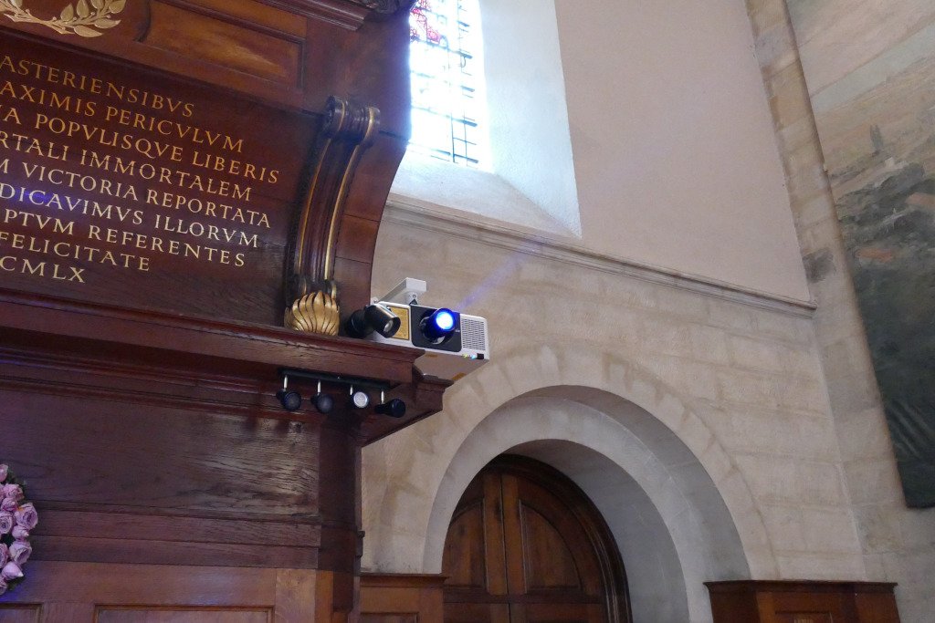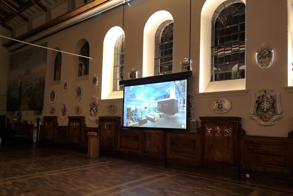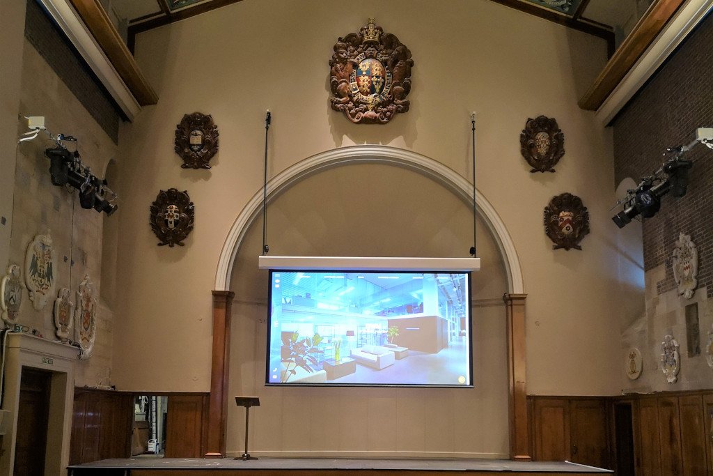 The need to remain sympathetic to the aesthetic was countered by providing Sapphire Smart Move projector screens, allowing the screen housing itself to be lowered before the actual screen – massively reducing the visual impact of a larger housing (needed for length screen drops). The Smartmove screens were housed at each projection location and were automated to lower and present correctly whenever the projector was turned on.